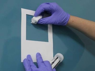 We secure a small 10cm x 10cm template on the surface to define the area to be tested.